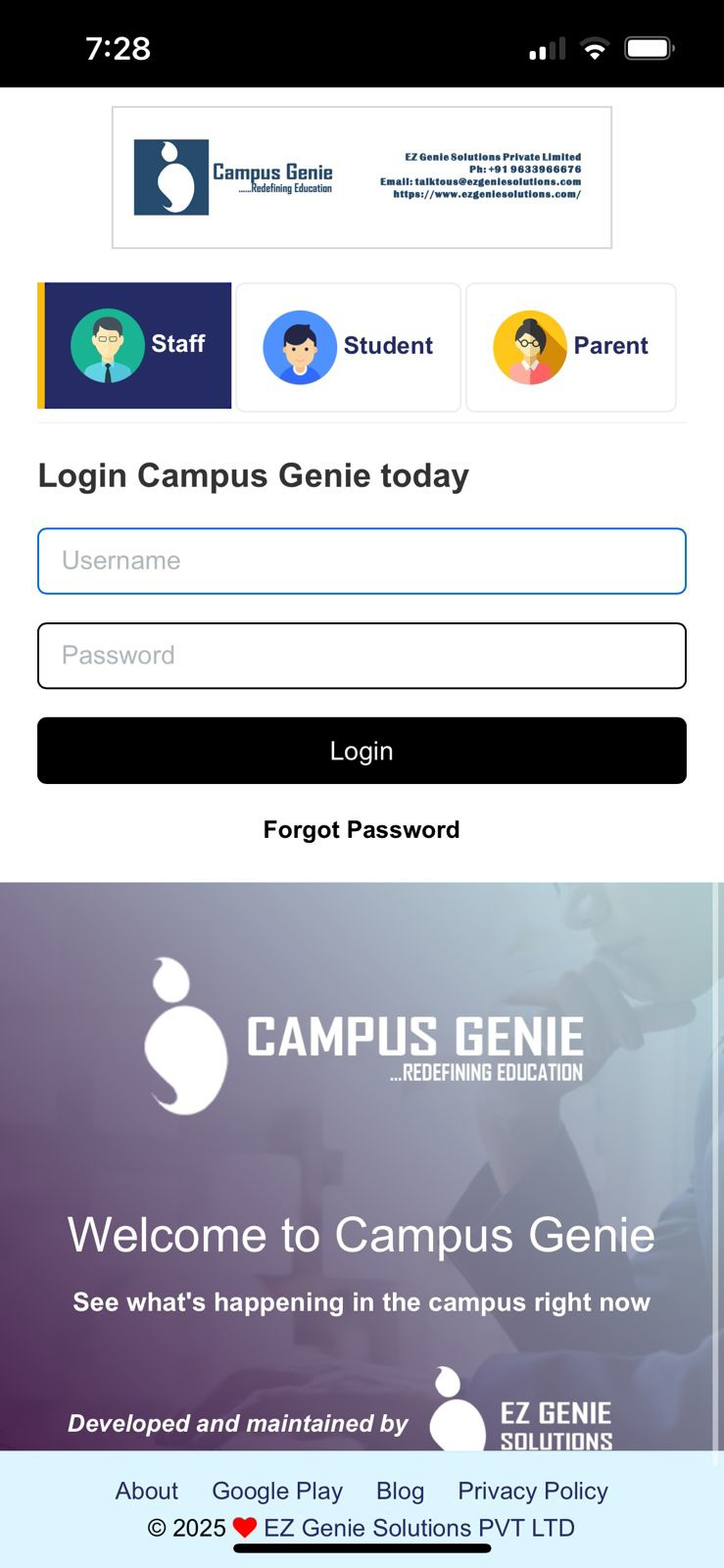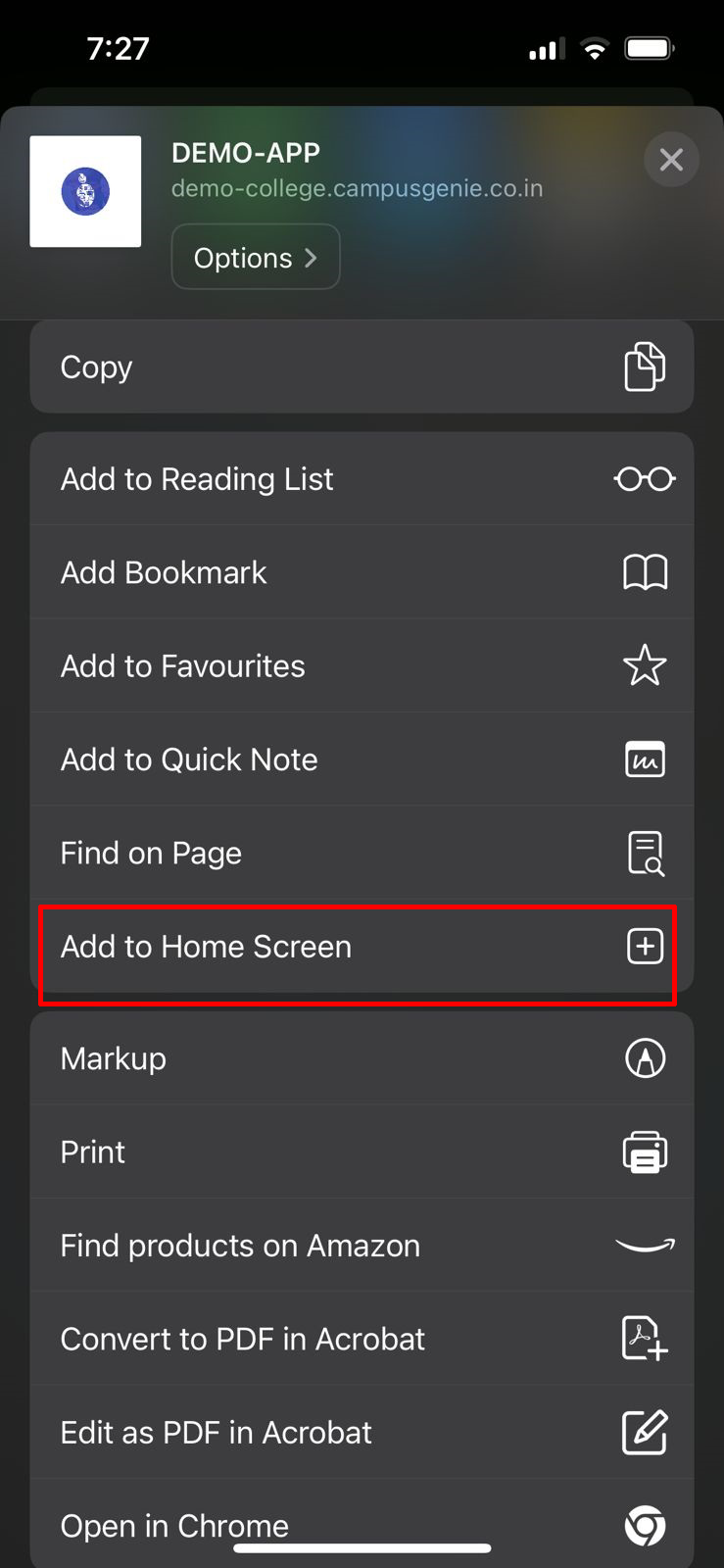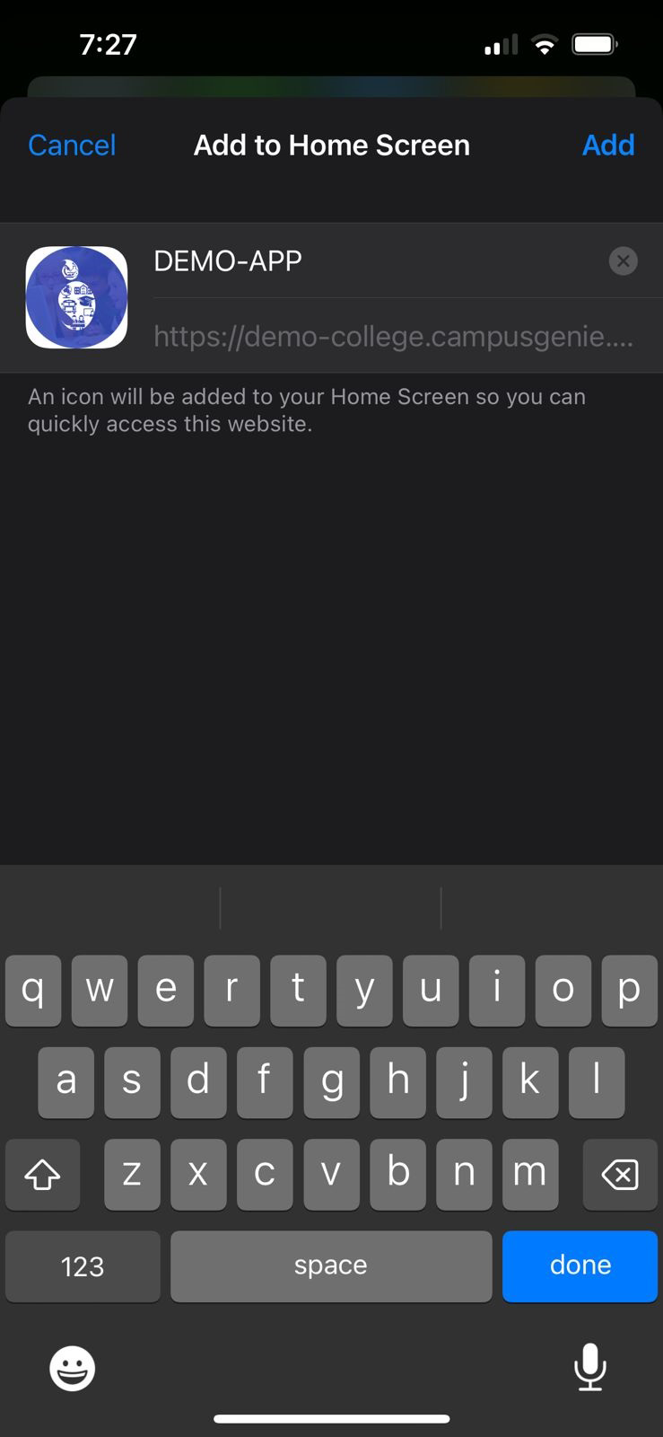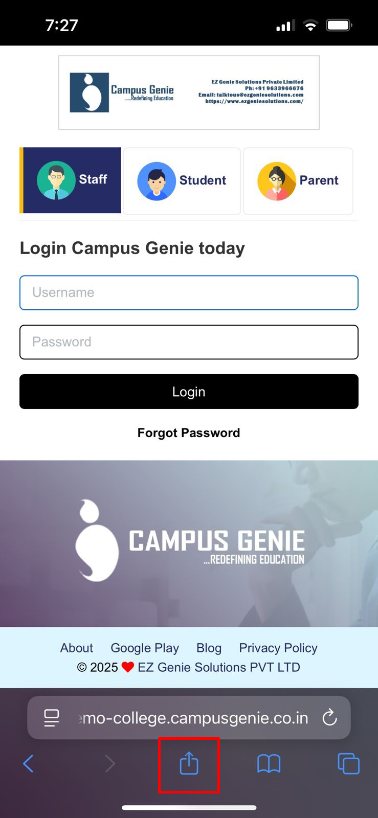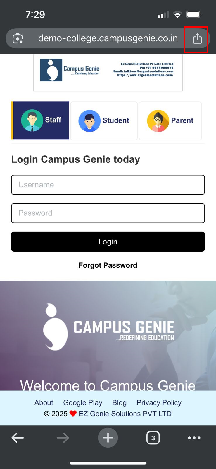 Safari browser on your mobile and type your campus url (https://snckollam.campusgenie.co.in) in the search bar, and click on the share icon